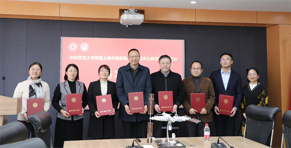 徐敏宣布物理上海市级实验教学示范中心教学指导委员会成立,并为委员会专家发放聘书,包括中国科学技术大学张增明教授、上海交通大学胡其图教授、东北师范大学李金环教授、复旦大学乐永康教授,华东师范大学教务处处长周先荣教授、物理系系主任陈丽清教授和物理实验教学中心主任詹清峰教授,张增明教授任主任委员。