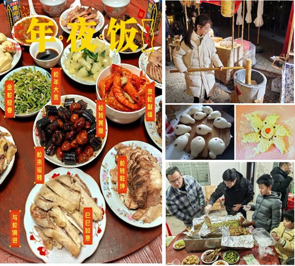 民以食为天,年味蕴涵在各地的特色美食中。有的老师分享北方的传统美食蒸花馍、切饺子皮,有的老师分享南方的打年糕、米花糖,还有的干脆端上一头烤全猪,寓意“诸事如意”。杨欣怡老师以“蛇年”为主题,别出心裁地制作“巳巳如意”“与蛇俱进”“灵蛇献福”等菜品,蕴涵着别样的祝福。