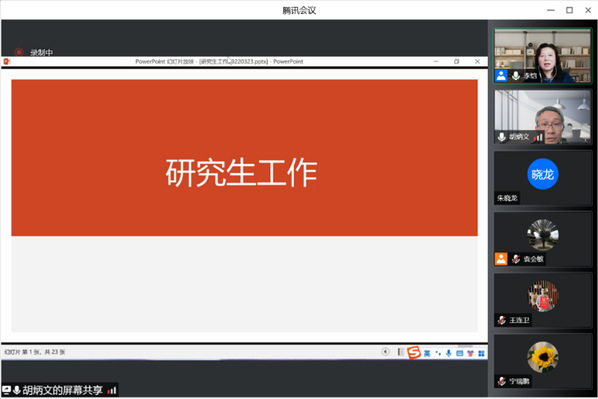 学院副院长胡炳文通报近期研究生工作情况。他首先介绍了封闭管理期间的研究生复试、课程安排、博士生毕业等事宜的具体安排,并对研究生线上面试的技术条件、评审要求及问题处理作了详细说明,对在校园(准)封闭管理期间,毕业生面临的学位论文答辩审批流程、网络视频答辩的组织开展等问题提出了解决方案。