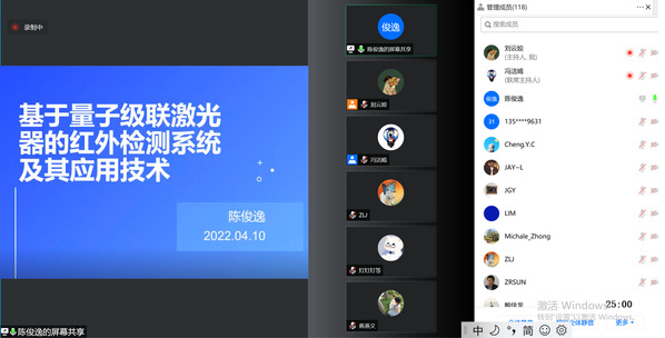 实验室副主任陈少强、张诗按分别主持会议报告。青年学者朱岩博士报告了高端芯片的研发和国产化进程;陈俊逸博士报告了基于量子级联激光器的红外检测系统及其相关应用;乌星博士报告了基于冷分子的电子电偶极精确测量研究;舒驰博士报告了量子纠缠增强光晶格钟的最新研究进展;刘易周博士报告了电、声子材料的新奇量子物性研究;盛继腾研究员报告了基于腔光力的非平衡热力学研究;潘登研究员报告了微纳尺度热辐射中的新物理研究。