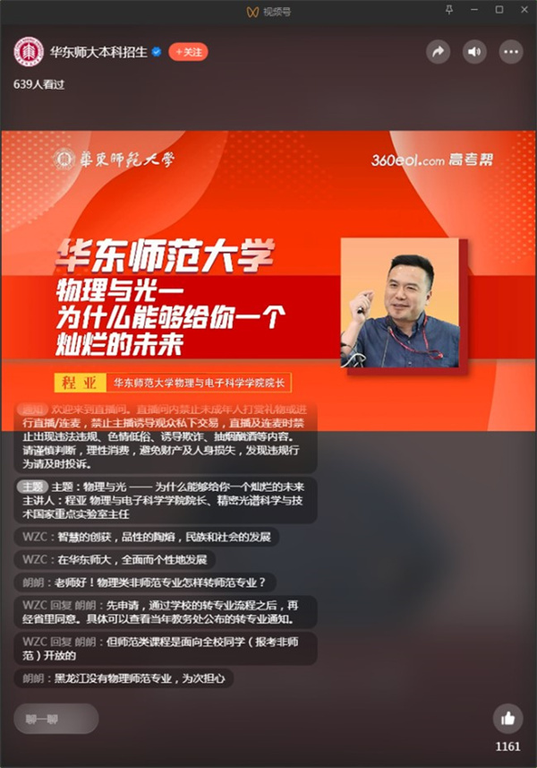 4月25日晚,学校招办举办“学院揽胜”活动,学院院长、精密光谱国重实验室主任程亚在本场学院专场宣讲中,作“物理与光——为什么能够给你一个灿烂的未来”讲座,程亚从招生政策、师资优势、人才培养、科研团队等角度,全面介绍了学院的整体情况。