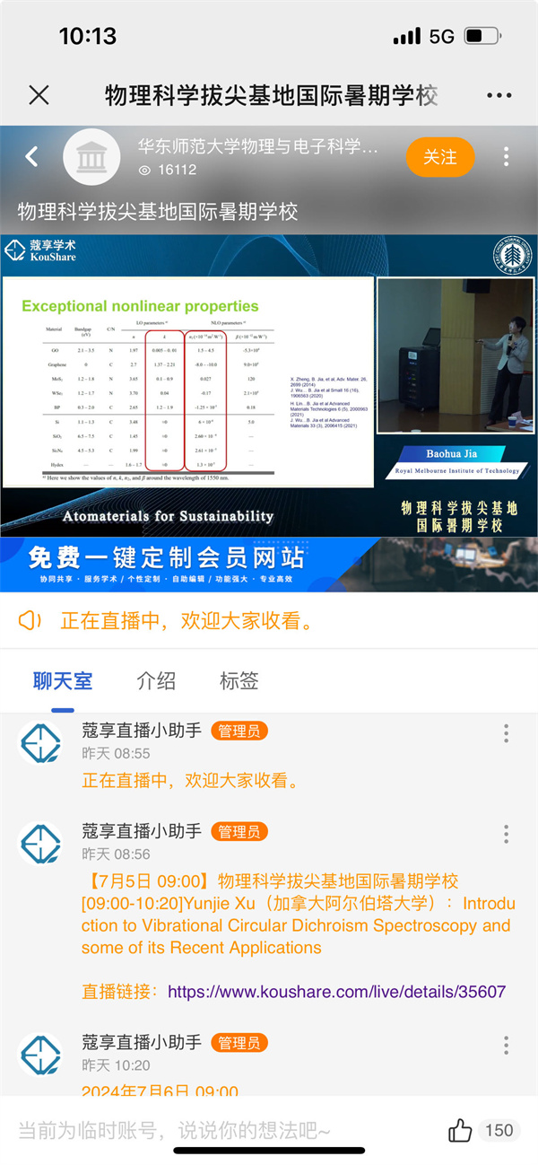 在为期一周的暑期学校中,学院邀请到来自加拿大阿尔伯塔大学、巴黎萨克雷大学、澳大利亚皇家理工学院、澳大利亚昆士兰大学、香港城市大学、上海交通大学、中国科技大学、山西大学、中科院上海光机所及华东师范大等海内外知名高校和研究院所的17位领域内顶尖专家学者做专题学术报告。其中五场海外院士报告同步在拔尖线上书院和寇享平台同步直播,观看量16000余次。