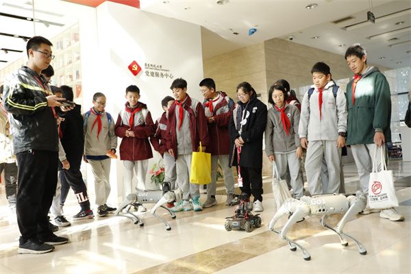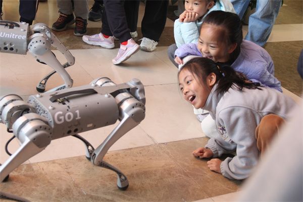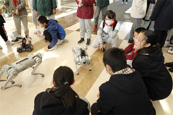 本期亲子科普活动还增加了机器狗和机械小车的表演环节。机器狗在上海市通用技术基地师生的演示下,完成了走路、拜年、跳跃、翻跟头等多种复杂的运动和交互,给孩子们带来了互动惊喜。