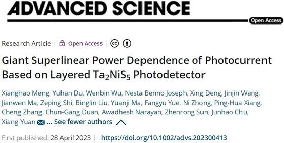 近日,华东师范大学袁翔课题组在基于二维窄带隙半导体Ta2NiS5制作的光电探测器中观测到超线性光电流。相关成果以《Giant Superlinear Power Dependence of Photocurrent Based on LayeredTa2NiS5 Photodetector》为题在《AdvancedScience》期刊上于2023年4月28日在线发表。