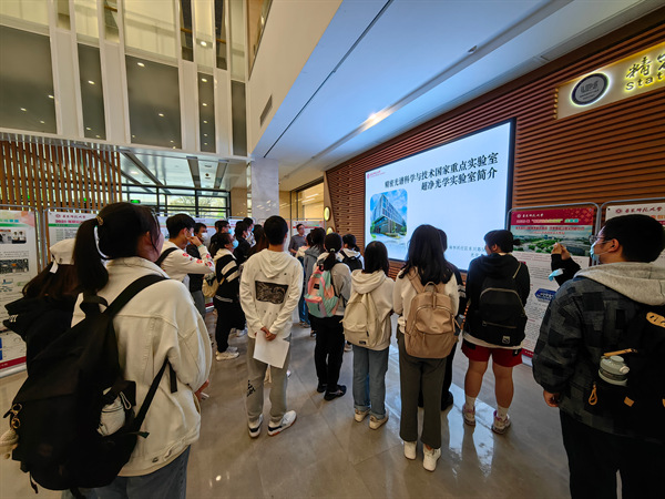 在精密光谱国重实验室党总支副书记马玲,精密光谱国重实验室教工第一党支部书记、教授级高级工程师潘海峰的引导下,2022级物理学专业本科生分批次参观了实验室,潘海峰首先介绍了实验室的基本情况及需要注意的安全事项。同学们分为四组进行参观,在低维结构超快光谱实验室,志愿者详细介绍了实验器械各部分组成和原理;在精密光谱技术实验室,志愿者以探测器在上海宝山钢铁厂的应用、激光在现代医学上的应用等为例,讲解了精密光谱技术的发展现状;徐信业教授课题组的志愿者详细介绍了课题组经过几年努力搭建的超稳光学参考腔系统。志愿者师生同步鼓励本科新生在完成课堂学习的基础上,主动走进实验室,积极参加科研活动、探讨学术问题,尽早确立未来主攻的研究方向。