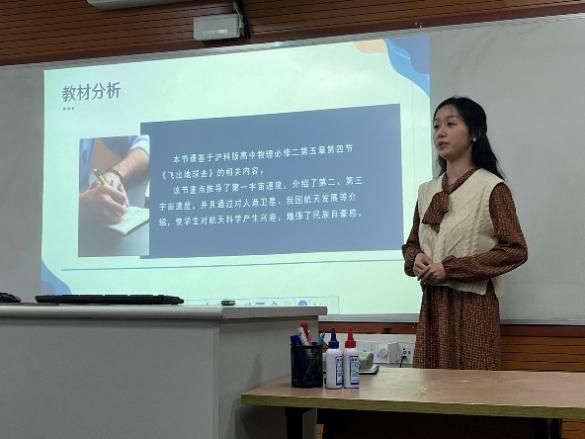 研究生组许天乐同学以两个装有水和浮沉子的水瓶作为实验仪器,从教材分析、学情分析、教学目标、教学重难点、教学方法和教学过程等方面,对《神奇的浮沉子》进行了说课展示;贾蕊旗同学说课内容风趣幽默,讲解了量子力学的奇妙之处;张航同学借助热播电影“流浪地球”,分享了《地球如何去流浪?》,将第一宇宙速度、第二宇宙速度和第三宇宙速度的知识生动地传授给学生们;刘益秀同学带来了《动能定理》的说课,说课过程逻辑性强、趣味性高。